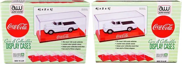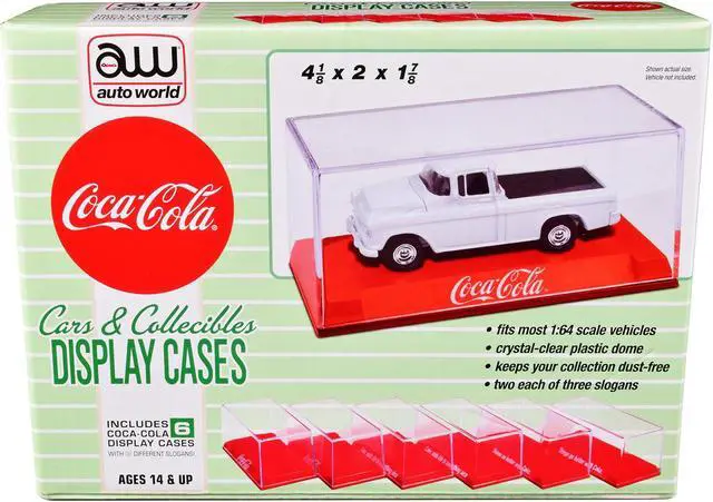 Brand new 1/64 scale of 6 Collectible Acrylic Display Show Cases with Red Plastic Bases with 3 Different Slogans "Coca-Cola" for 1/64 scale model cars by Auto World.