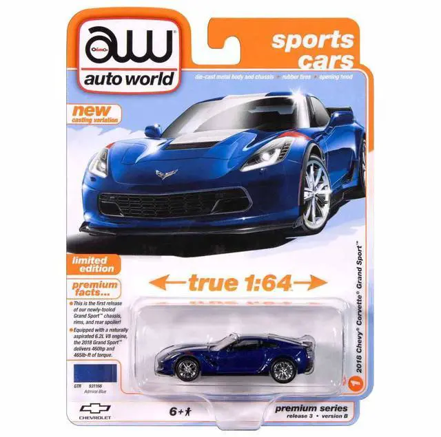 Brand new 1/64 scale diecast car model of 2018 Chevrolet Corvette Grand Sport Admiral Blue with White Stripe "Sports Cars" Series die cast model car by Auto World.