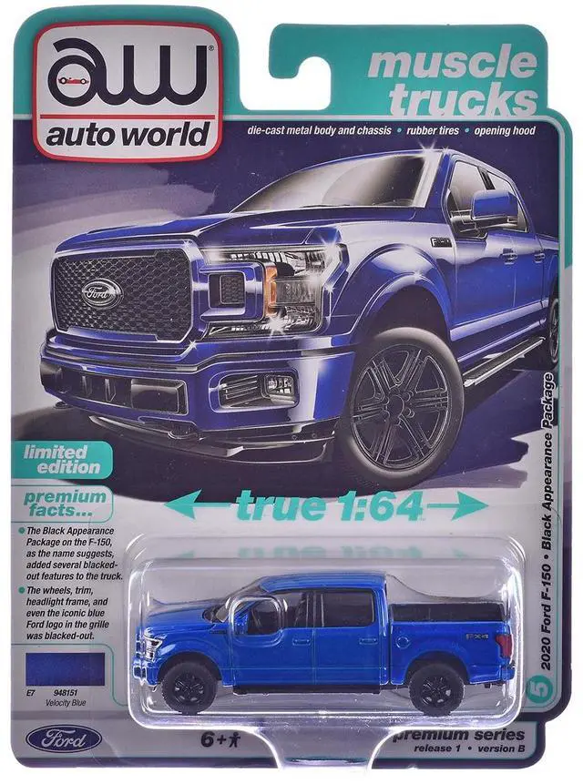 Brand new 1/64 scale diecast car model of 2020 Ford F-150 FX4 Black Appearance Package Pickup Truck Velocity Blue "Muscle Trucks" Series die cast model car by Auto World.