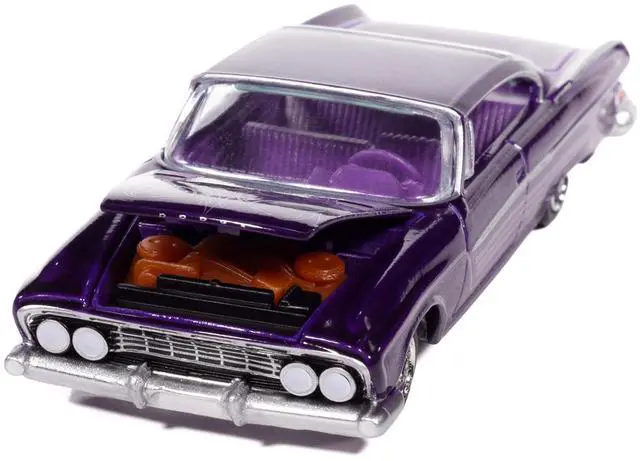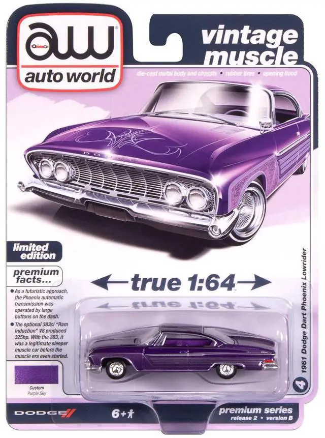 Brand new 1/64 scale diecast car model of 1961 Dodge Dart Phoenix Lowrider Purple Sky Metallic with Graphics and Purple Interior "Vintage Muscle" Series die cast model car by Auto World.