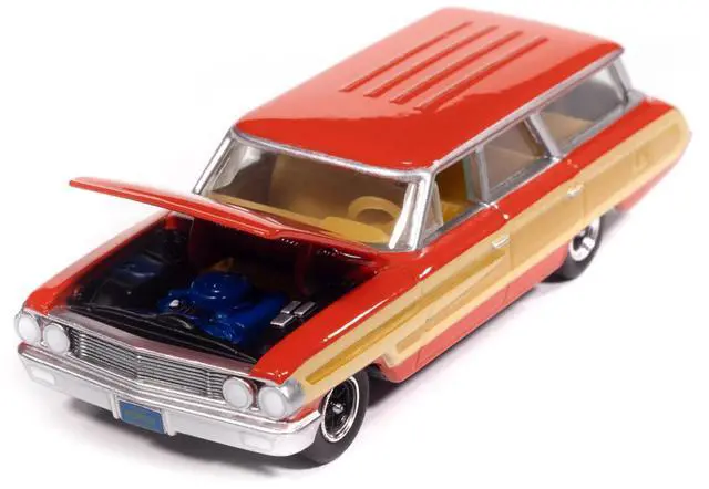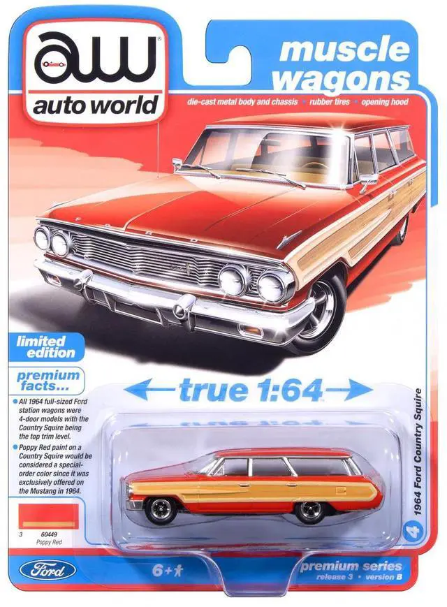 Brand new 1/64 scale diecast car model of 1964 Ford Country Squire Poppy Red with Woodgrain Sides "Muscle Wagons" Series die cast model car by Auto World.