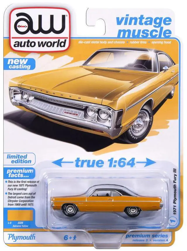Brand new 1/64 scale diecast car model of 1971 Plymouth Fury III Bahama Yellow with Black Top "Vintage Muscle" Series die cast model car by Auto World.