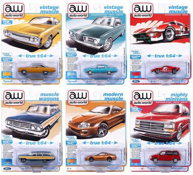 Brand new 1/64 scale diecast car models of Auto World Premium 2025 Release 3 Set A of 6 pieces die cast model cars by Auto World.