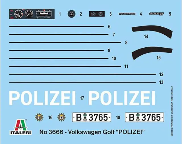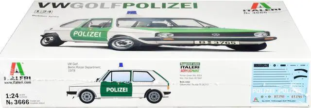 Brand new 1/24 scale plastic model kit of 1978 Volkswagen Golf "Berlin Polizei (Police) Department" (Skill 3) 1/24 plastic model kit by Italeri.