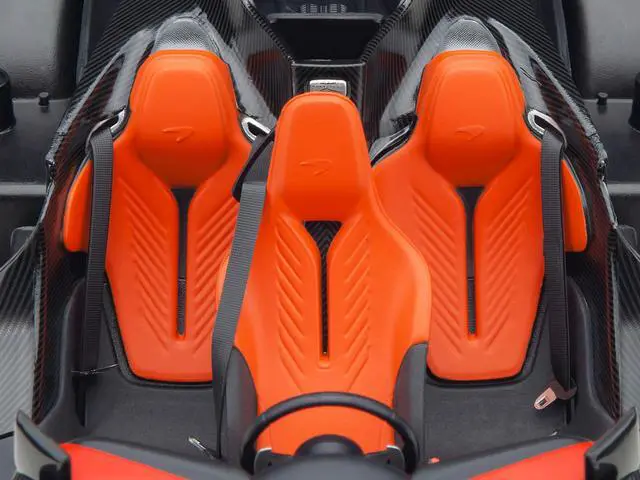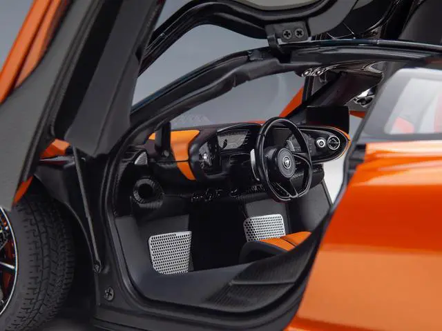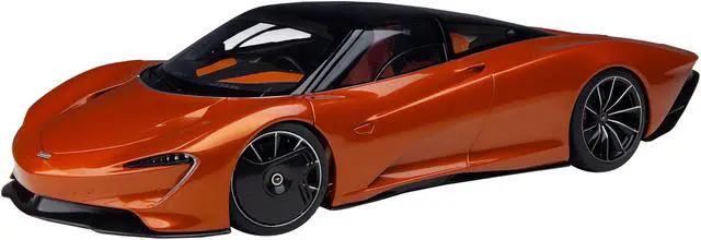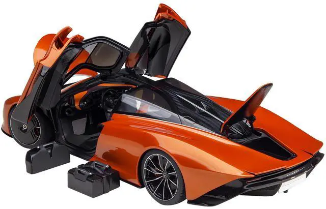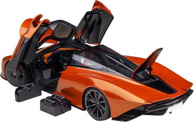 Brand new 1/18 scale car model of McLaren Speedtail Volcano Orange Metallic with Black Top and Suitcase Accessories model car by Autoart.