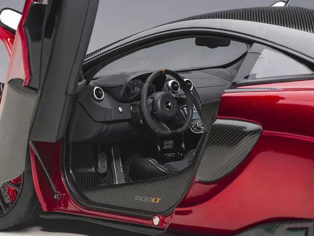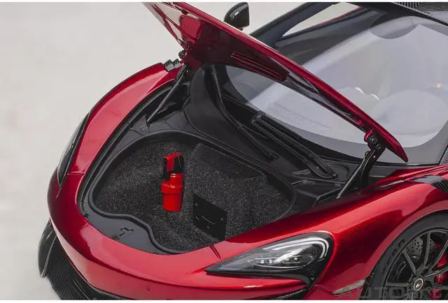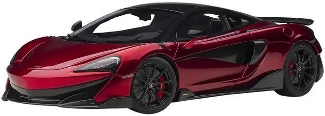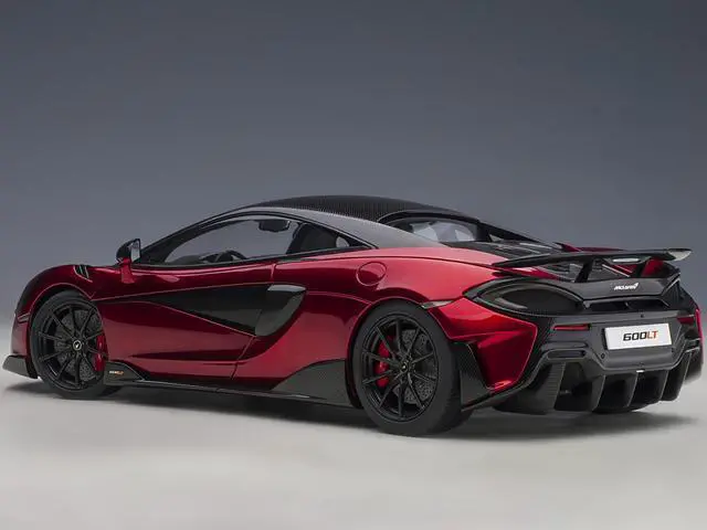 Brand new 1/18 scale car model of McLaren 600LT Vermillion Red and Carbon model car by Autoart.