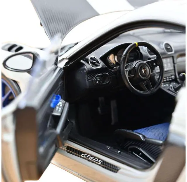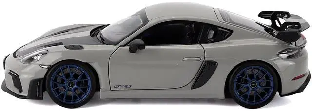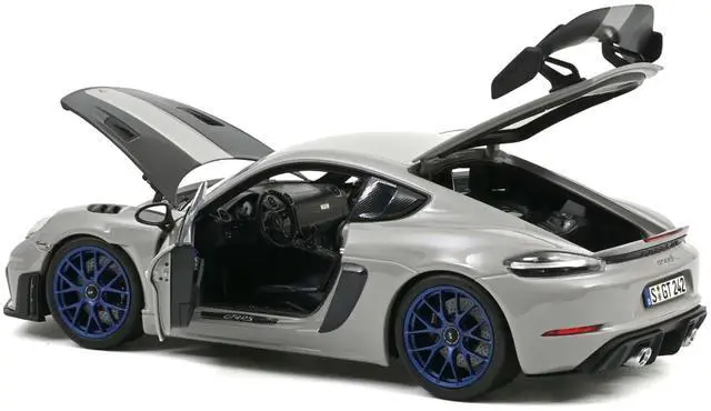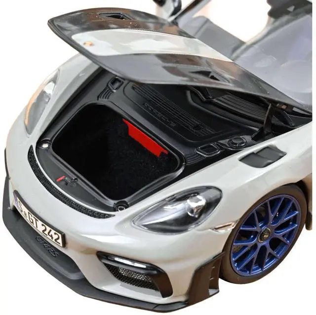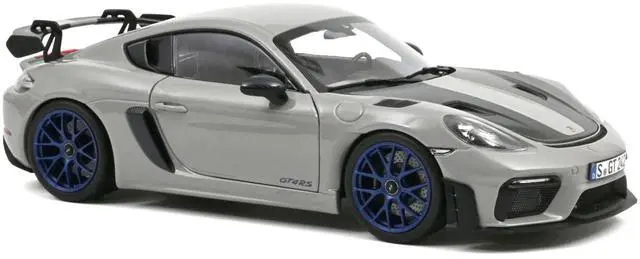 Brand new 1/18 scale diecast car model of 2023 Porsche Cayman GT4 RS Weissach Pack Chalk Gray with Carbon Hood Stripes die cast model car by Norev.