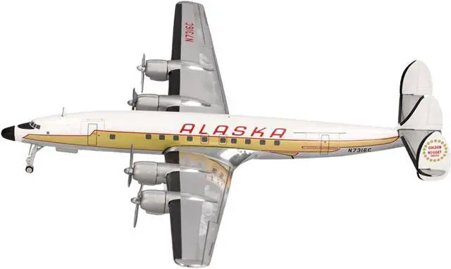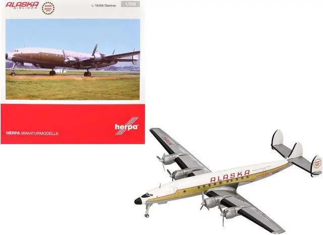 Brand new 1/200 scale diecast airplane model of Lockheed L-1649A Starliner Commercial Aircraft "Alaska Airlines - Golden Nugget Service" (N7316C) White and Gold with Red Stripes die cast model by Herpa.