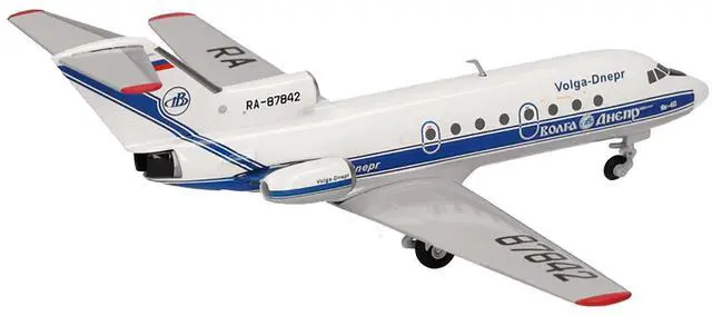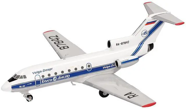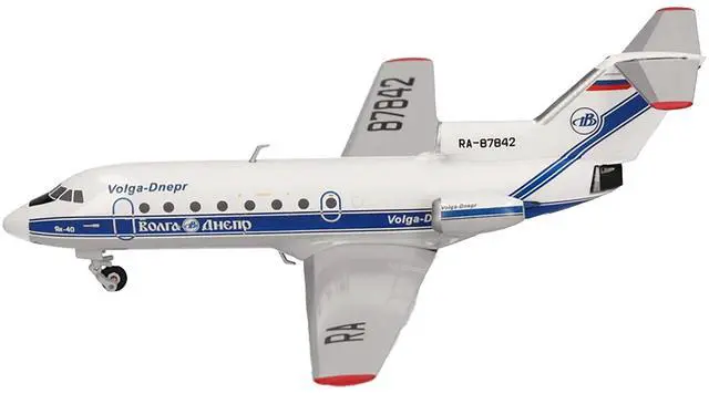 Brand new 1/200 scale diecast airplane model of Yakovlev Yak-40 Commercial Aircraft "Volga-Dnepr Airlines" (RA-87842) White with Blue Stripes die cast model by Herpa.
