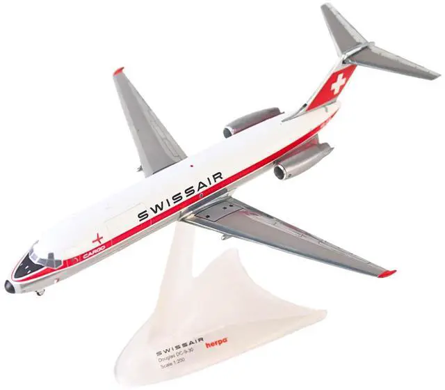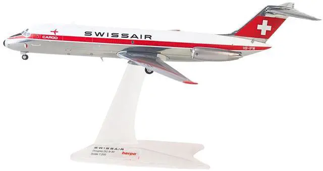 Brand new 1/200 scale diecast airplane model of Douglas DC-9-30F Commercial Aircraft "Swissair" (HB-IFW) White with Red Stripes die cast model by Herpa.