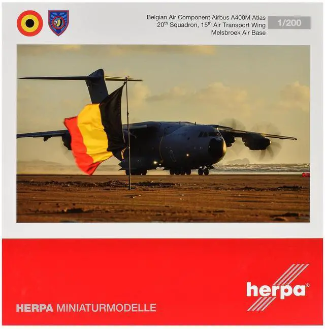 Brand new 1/200 scale diecast airplane model of Airbus A400M Atlas Transport Aircraft "20th Squadron, 15th Wing, Melsbroek Air Base" Belgian Air Component die cast model by Herpa.