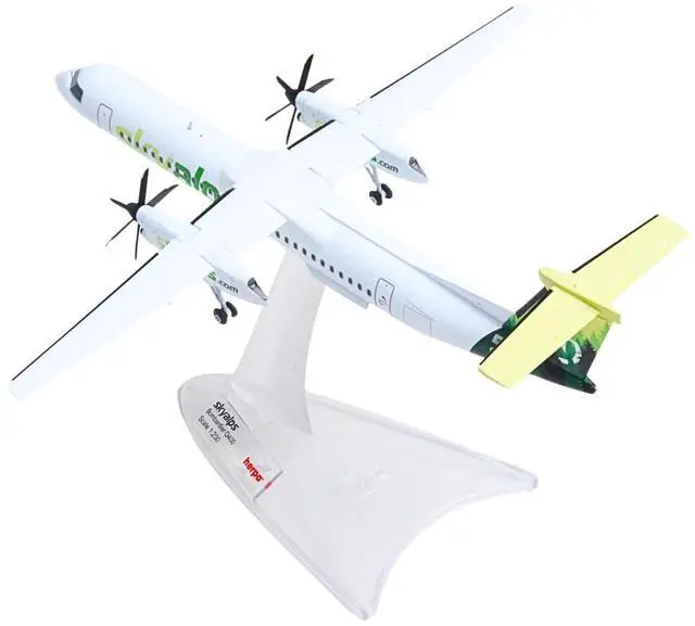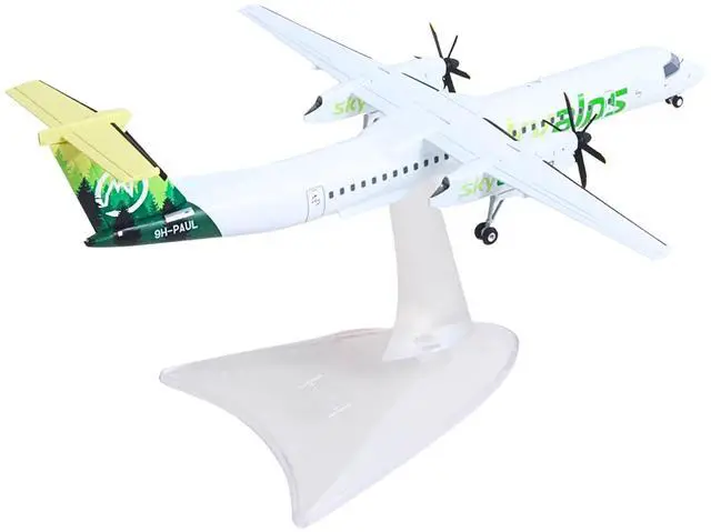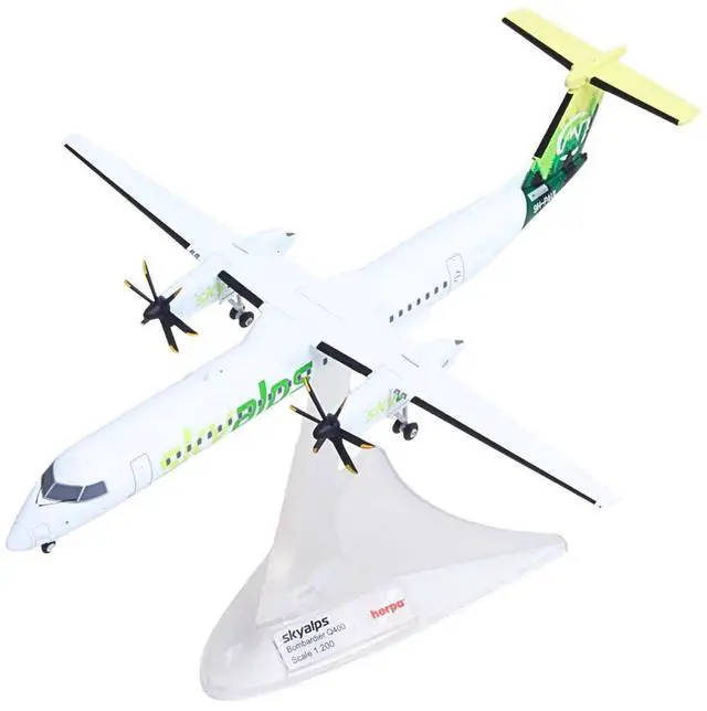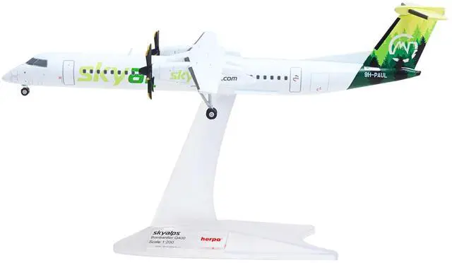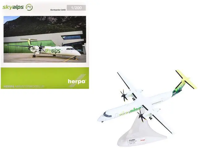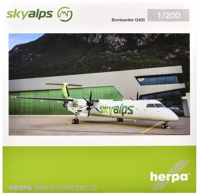 Brand new 1/200 scale diecast airplane model of Bombardier Q400 Commercial Aircraft "Sky Alps" (9H-PAUL) White with Green Tail Graphics die cast model by Herpa.