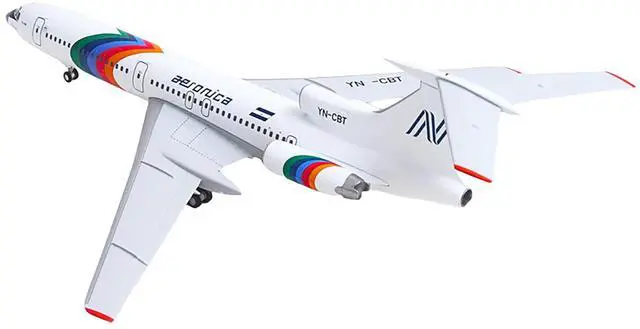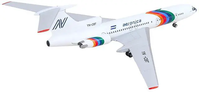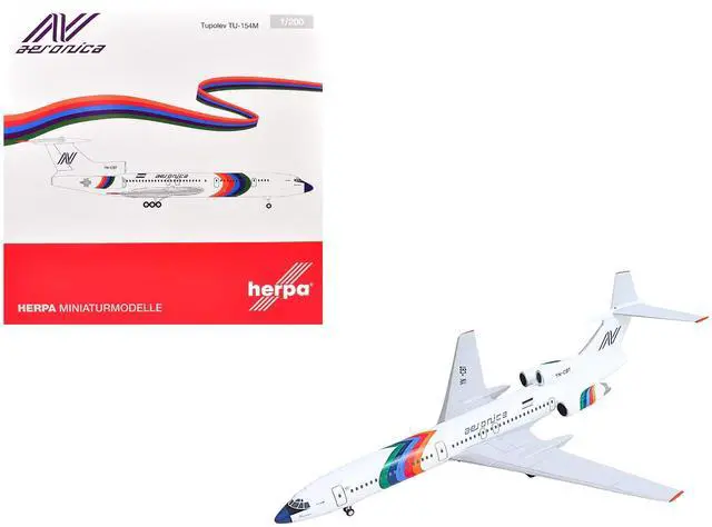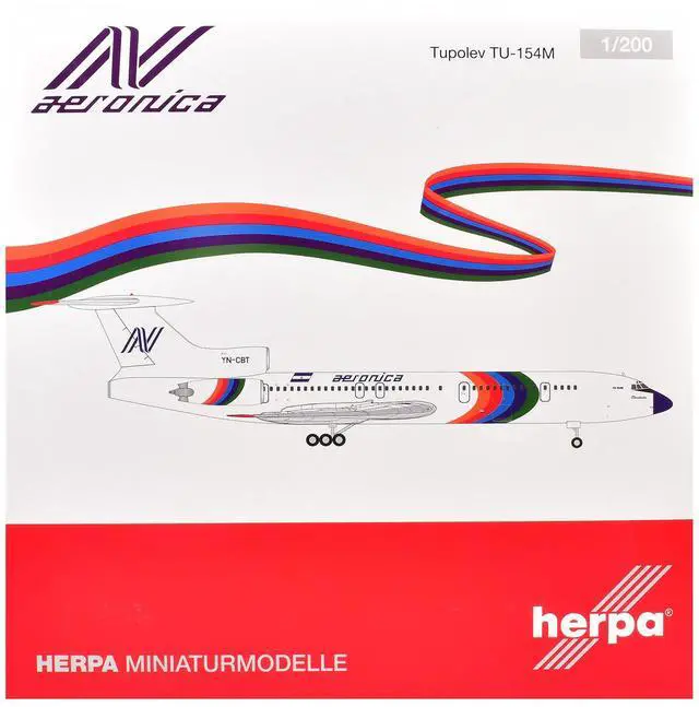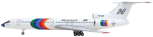 Brand new 1/200 scale diecast airplane model of Tupolev TU-154M Commercial Aircraft "Aeronica" (YN-CBT) White with Stripes die cast model by Herpa.