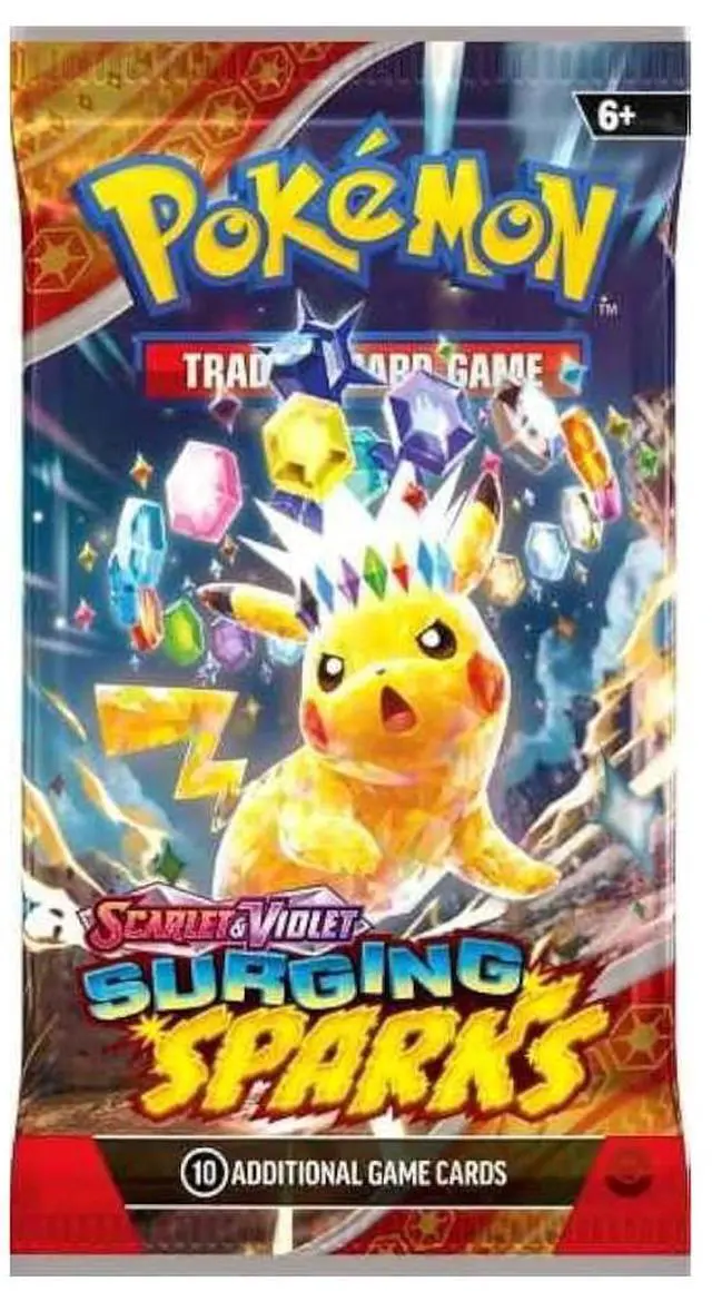 Pokémon Scarlet & Violet: Surging Sparks Booster Packs. Dive into a dynamic tropical setting where electrifying energy meets legendary creatures. This expansion features the supercharged Pikachu ex, alongside an impressive lineup of dragon Pokémon, including the majestic Alolan Exeggutor ex, powerful Archaludon ex, and enigmatic Latias ex. Each booster pack contains 10 random cards, allowing you to enhance your deck with new ACE SPEC cards and surprise Pokémon ex. Unleash the power of currents and the roar of dragons in your next battle with this exciting addition to your collection. Perfect for both seasoned players and new enthusiasts, the Surging Sparks expansion brings an exhilarating blend of strategy and adventure to the world of Pokémon.