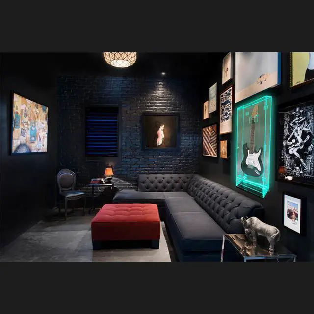 To top it all off, this case is wired with tri-color LED lights which give the case an amazing neon-like glow which can be controlled by the included remote control. With over 15 different light settings and three colors (white, purple and green), you can create an ultra cool vibe in your man cave when the guys are over. This guitar case measures 48" x 16.25" x 5.2" deep. Can fit most electric guitars up to 44". Inside cabinet dimensions are 45" tall by 15.25" wide and 4.5" deep. Distance from inside bottom of cabinet to the top of the mounts is 38".