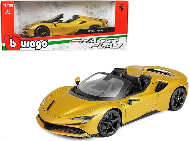 Brand new 1/18 scale diecast car model of Ferrari SF90 Spider Gold Metallic "Race + Play" Series die cast model car by Bburago.