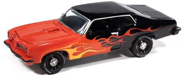 Brand new 1/64 scale diecast car model of 1974 Pontiac GTO Black and Red with Flame Graphics "Black with Flames" Series die cast model car by Johnny Lightning.