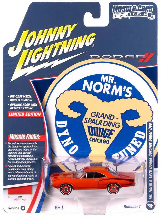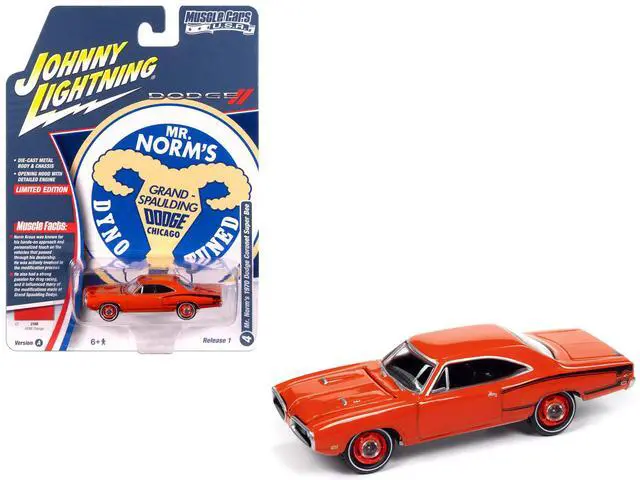 Brand new 1/64 scale diecast car model of 1970 Dodge Coronet Super Bee "Mr. Norm's" Hemi Orange with Black Stripes "Muscle Cars USA" Series die cast model car by Johnny Lightning.