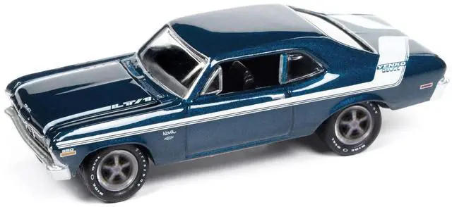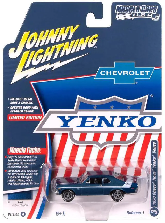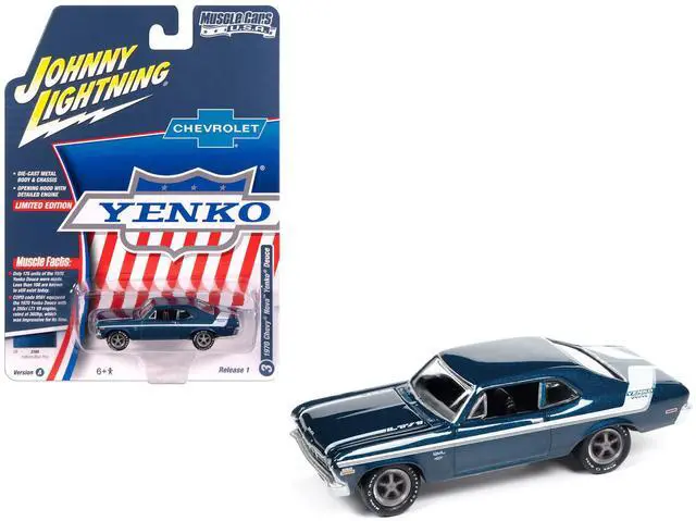Brand new 1/64 scale diecast car model of 1970 Chevrolet Nova Yenko Deuce Fathom Blue Metallic with White Stripes "Muscle Cars USA" Series die cast model car by Johnny Lightning.