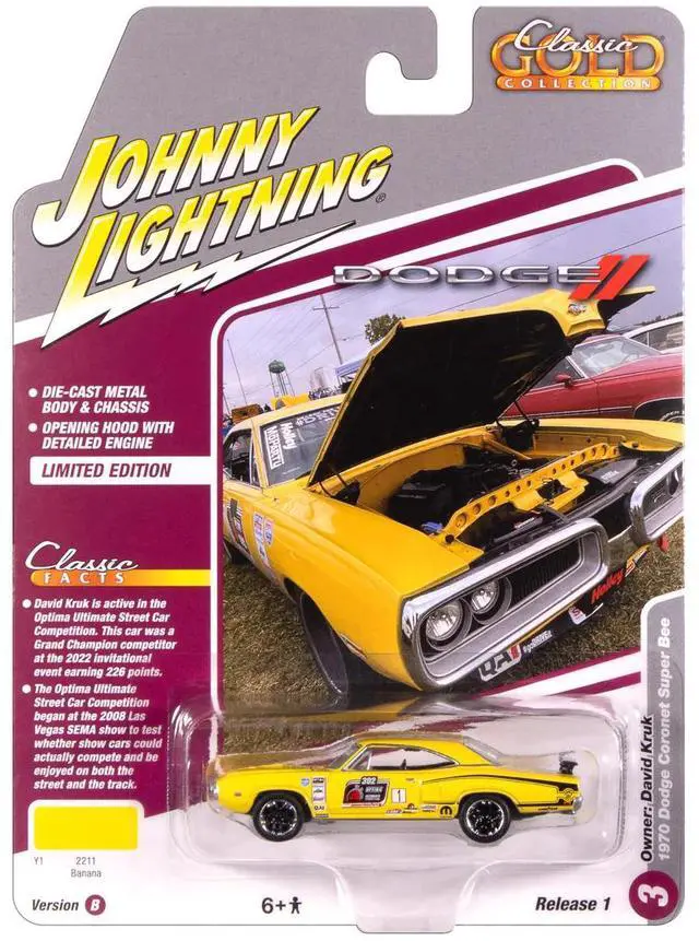 Brand new 1/64 scale diecast car model of 1970 Dodge Coronet Super Bee #1 "David Kruk" Banana Yellow with Black Stripes and Top "Classic Gold Collection" die cast model car by Johnny Lightning.