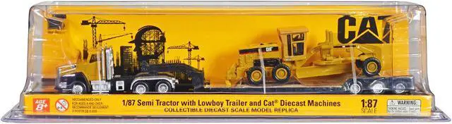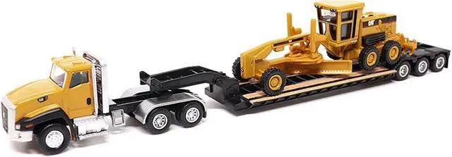 Brand new 1/87 (HO) scale diecast model of CAT Caterpillar CT660 Day Cab Tractor Yellow with Lowboy Trailer and CAT 163H Motor Grader Yellow die cast model by Diecast Masters.