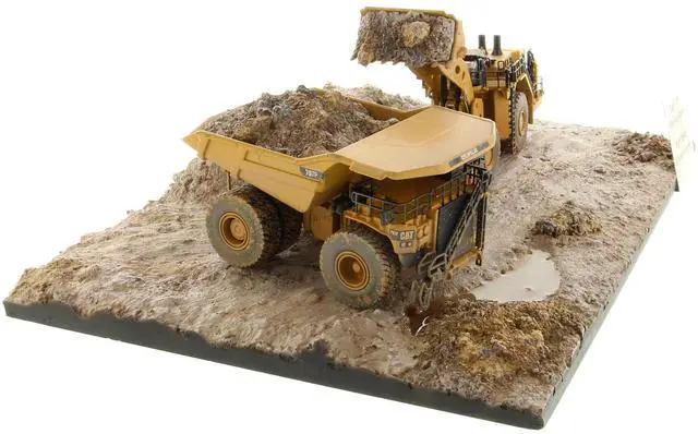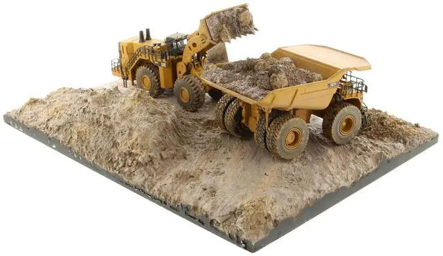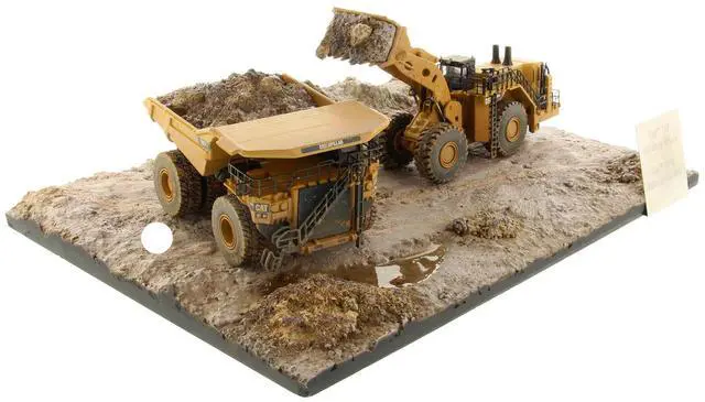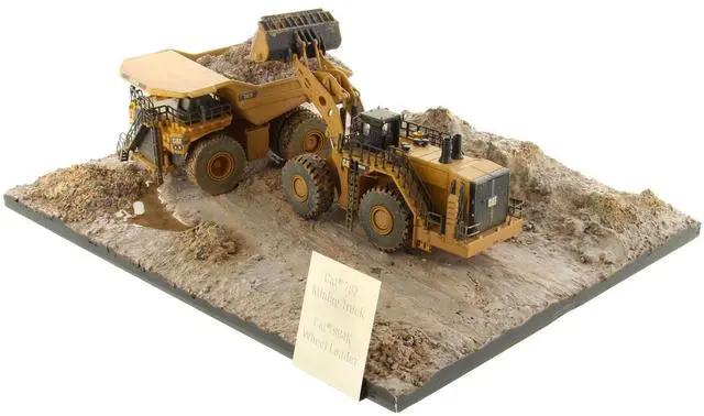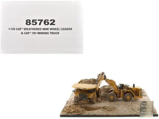 Brand new 1/125 scale diecast model of CAT Caterpillar 994K Wheel Loader and 797 Mining Truck Yellow (Weathered) Set of 2 Pieces "Weathered Series" die cast model by Diecast Masters.