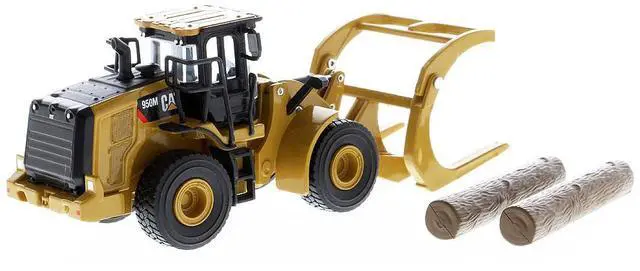 Brand new 1/64 scale diecast model of CAT Caterpillar 950M Wheel Loader with Bucket and Log Fork with Two Log Poles "Play & Collect! " die cast model by Diecast Masters.