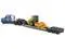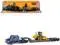 Lowboy trailer features rolling wheels and simulated wood deck finish.
