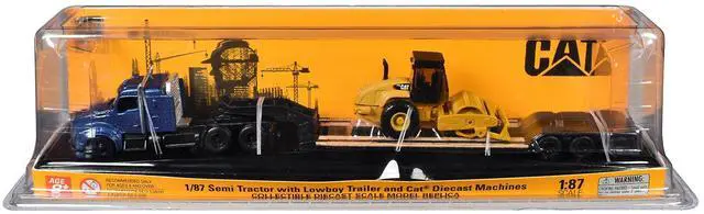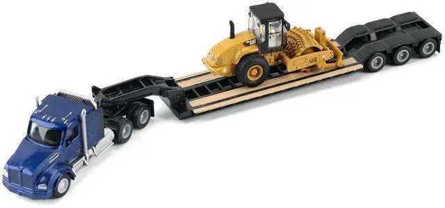 Brand new 1/87 (HO) scale diecast model of Kenworth T880 Tractor Blue Metallic with Lowboy Trailer and CAT Padfoot Roller Yellow die cast model by Diecast Masters.