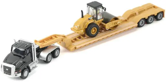 Brand new 1/87 (HO) scale diecast model of Kenworth T880 Tractor Black with Lowboy Trailer and CAT Roller Yellow die cast model by Diecast Masters.