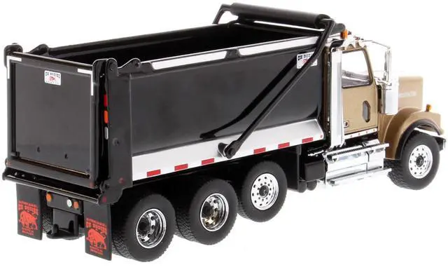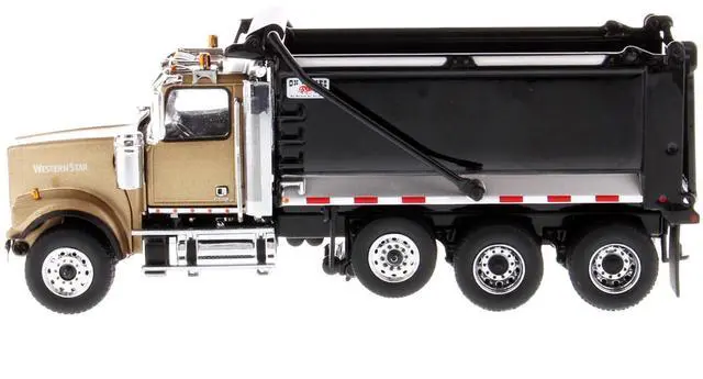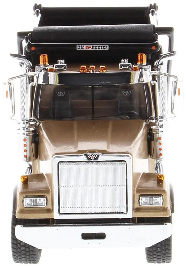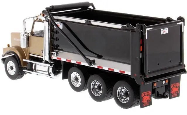 Brand new 1/50 scale diecast model of Western Star 4900 SFFA Tandem with Pusher Axle OX Stampede Dump Truck Gold and Black "Transport Series" die cast model by Diecast Masters.