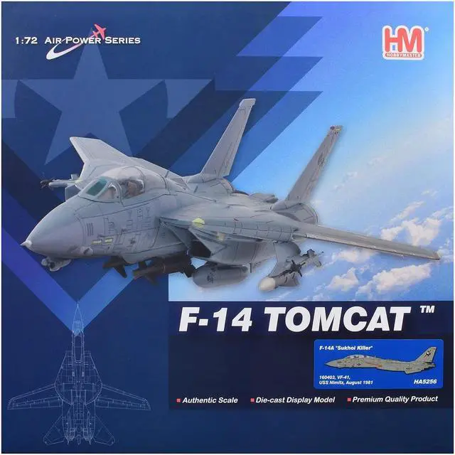 Brand new 1/72 scale diecast model of Grumman F-14A Tomcat Fighter Aircraft "Sukhoi Killer, VF-41 Black Aces, USS Nimitz" (1981) United States Navy "Air Power Series" die cast model by Hobby Master.