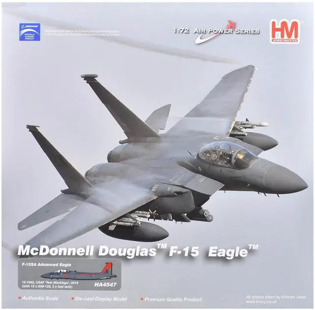 Brand new 1/72 scale diecast model of Boeing F-15SA (Saudi Advanced) Eagle Fighter Aircraft "12-1002, USAF Test Markings" (2018) Saudi Royal Air Force "Air Power Series" die cast model by Hobby Master.