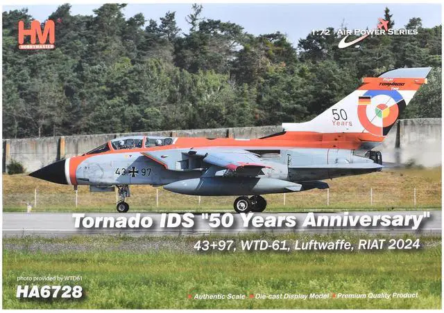 Brand new 1/72 scale diecast model of Panavia Tornado IDS Aircraft "43+97, WTD-61, 50 Years, Royal International Air Tattoo" (2024) German Luftwaffe "Air Power Series" die cast model by Hobby Master.
