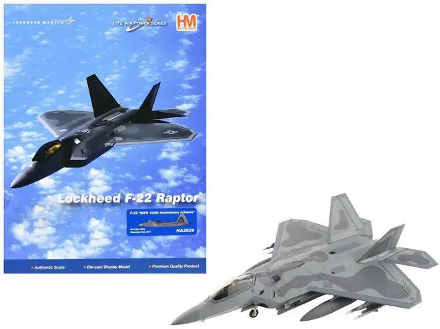 Brand new 1/72 scale diecast model of Lockheed F-22 Raptor Stealth Aircraft "09-4190, 90th Fighter Squadron 100th Anniversary, Elmendorf Air Base" (2017) United States Air Force "Air Power Series" die cast model by Hobby Master.