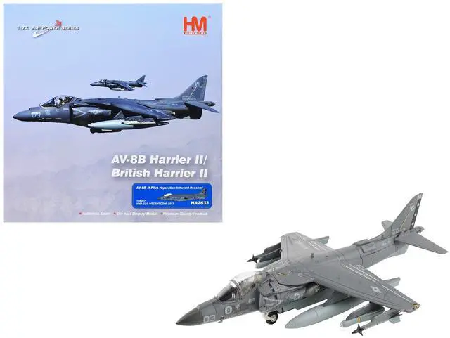 Brand new 1/72 scale diecast model of McDonnell Douglas AV-8B Plus Harrier II Aircraft "165357, VMA-231 Ace of Spades, Operation Inherent Resolve, USCENTCOM" (2017) United States Marine Corps "Air Power Series" die cast model by Hobby Master.
