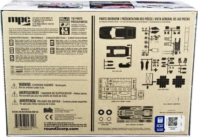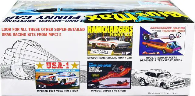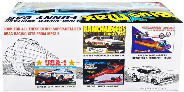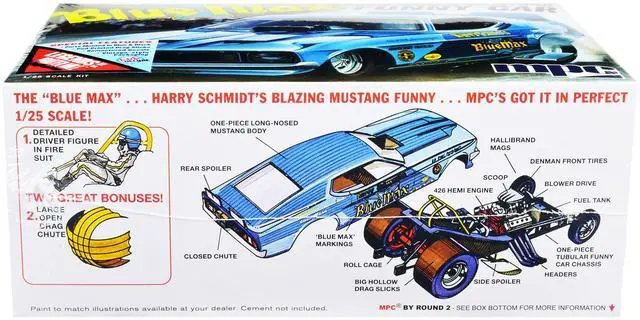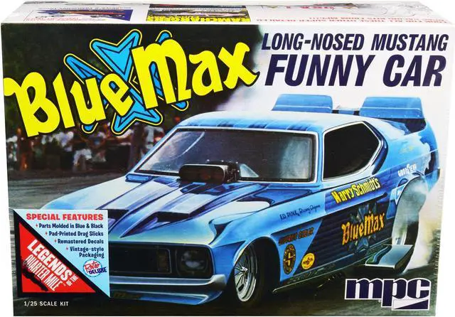 Brand new 1/25 scale plastic model kit of "Blue Max" Long Nose Mustang Funny Car (Skill 2) 1/25 plastic model kit by MPC.