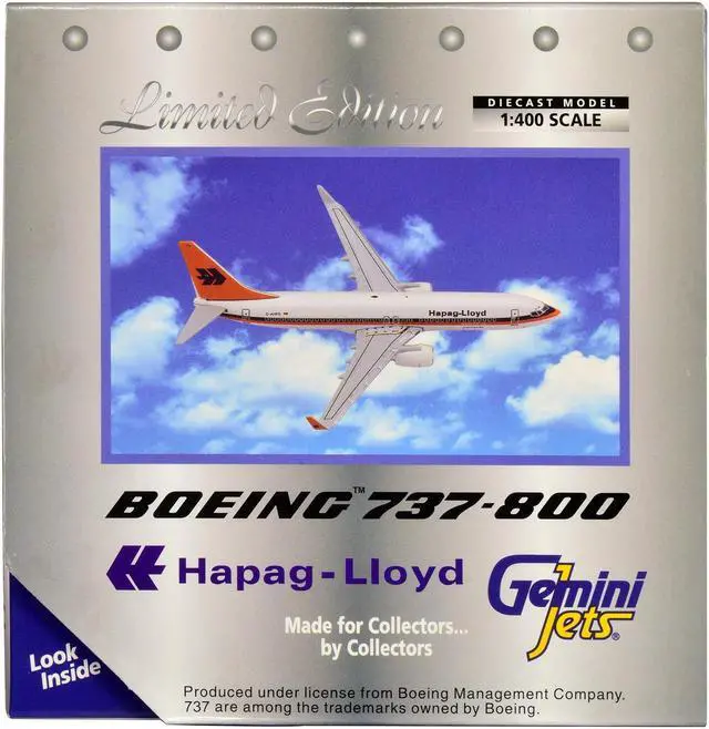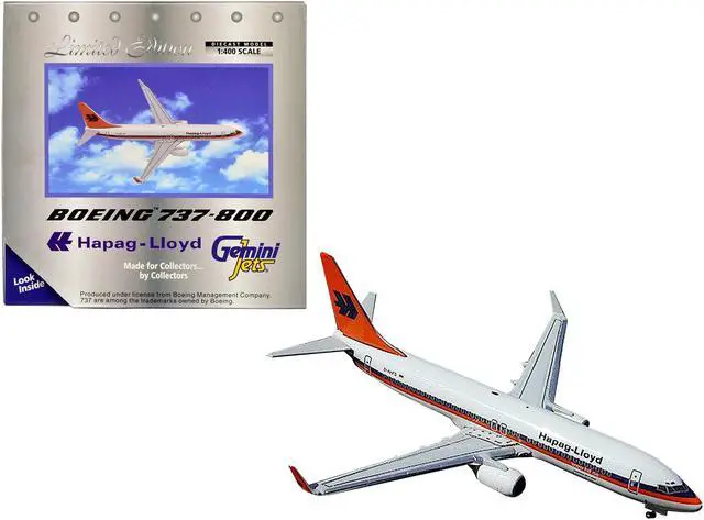 Brand new 1/400 scale diecast airplane model of Boeing 737-800 Commercial Aircraft "Hapag-Lloyd" White with Orange and Blue Stripes die cast model by GeminiJets.