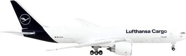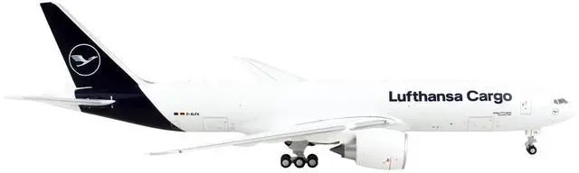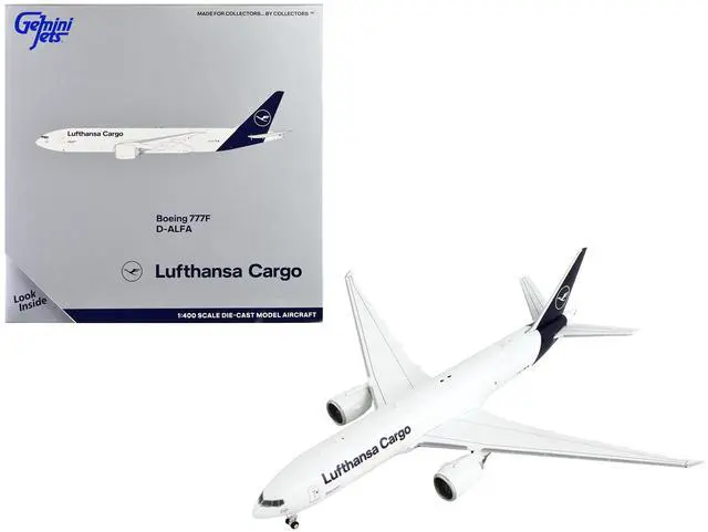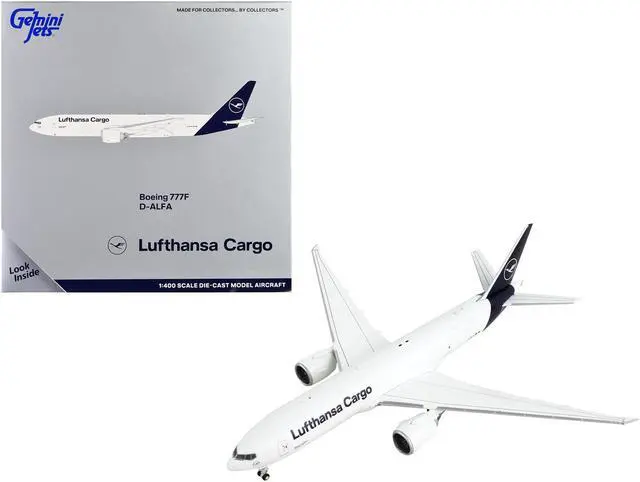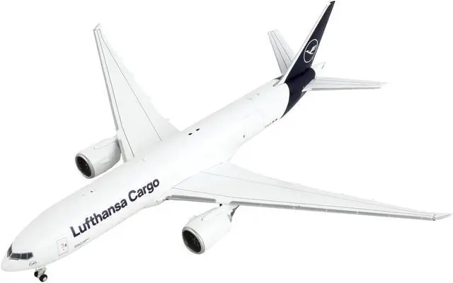 Brand new 1/400 scale diecast airplane model of Boeing 777F Commercial Aircraft "Lufthansa Cargo" White with Dark Blue Tail die cast model by GeminiJets.
