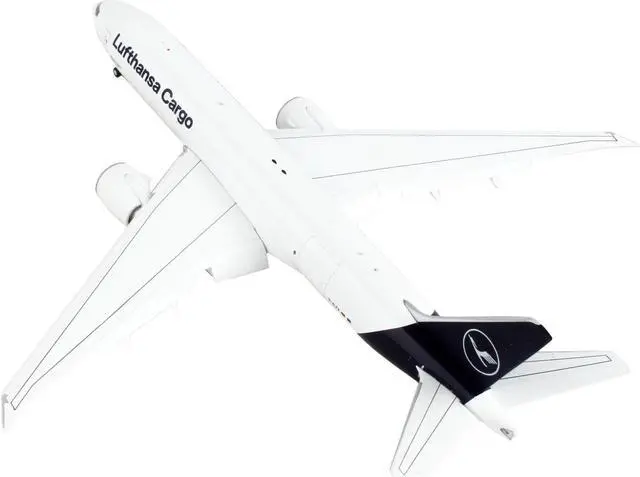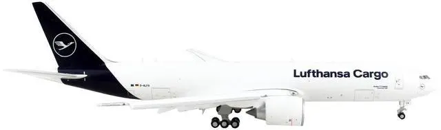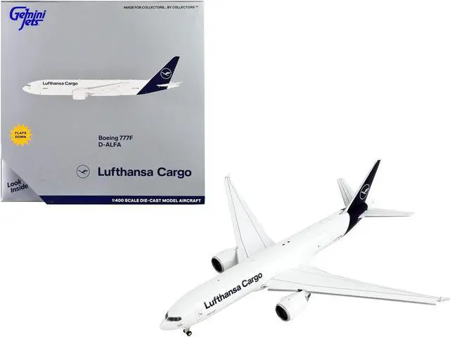 Brand new 1/400 scale diecast airplane model of Boeing 777F Commercial Aircraft with Flaps Down "Lufthansa Cargo" White with Dark Blue Tail die cast model by GeminiJets.