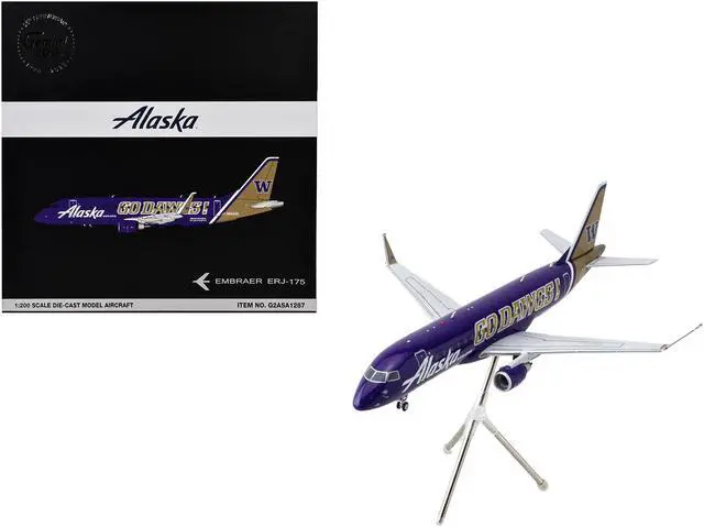 Brand new 1/200 scale diecast airplane model of Embraer ERJ-175 Commercial Aircraft "Alaska Airlines/Horizon - University of Washington Huskies" (N662QX) Purple with Gold Tail "Gemini 200" Series die cast model by GeminiJets.