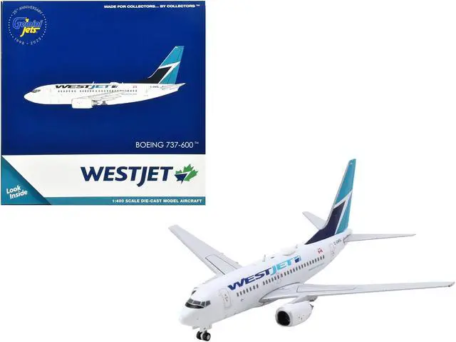 Brand new 1/400 scale diecast airplane model of Boeing 737-600 Commercial Aircraft "Westjet Airlines" (C-GWSL) White with Blue Tail die cast model by GeminiJets.
