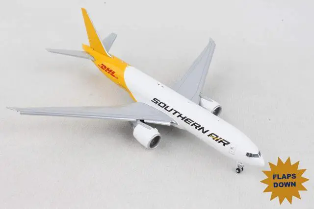 Brand new 1/400 scale diecast airplane model of Boeing 777F Commercial Aircraft with Flaps Down "Southern Air - DHL" White and Yellow die cast model by GeminiJets.