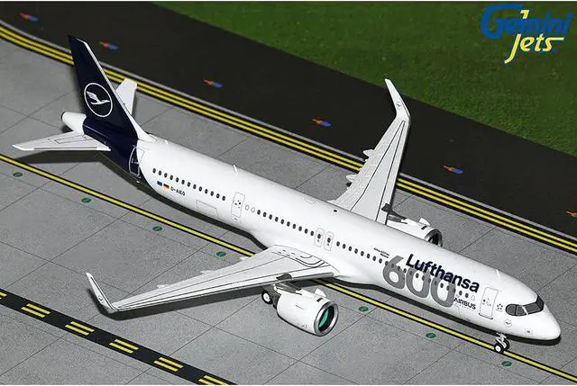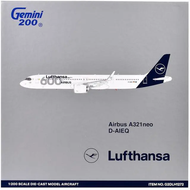 Brand new 1/200 scale diecast airplane model of Airbus A321neo Commercial Aircraft "Lufthansa - 600th Airbus Aircraft" (D-AIEQ) White with Dark Blue Tail "Gemini 200" Series die cast model by GeminiJets.