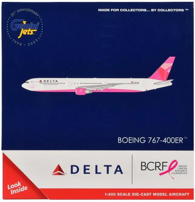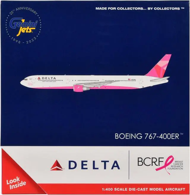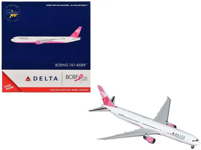 Brand new 1/400 scale diecast airplane model of Boeing 767-400ER Commercial Aircraft "Delta Air Lines - Breast Cancer Research Foundation" (N845MH) White with Pink Tail die cast model by GeminiJets.