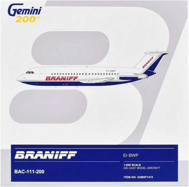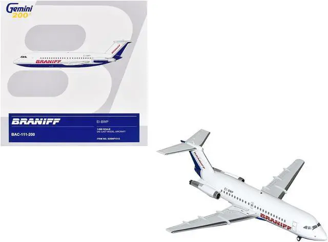 Brand new 1/200 scale diecast airplane model of BAC 111-200 Commercial Aircraft "Braniff International Airways" (EI-BWP) White with Blue Tail "Gemini 200" Series die cast model by GeminiJets.