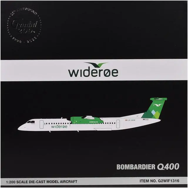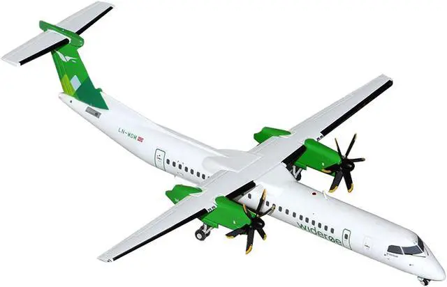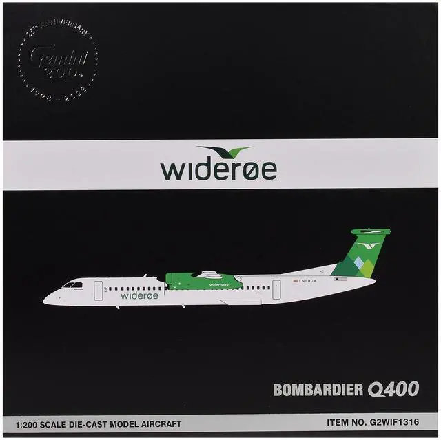 Brand new 1/200 scale die cast airplane model of Bombardier Q400 Commercial Aircraft "Wideroe" (LN-WDM) White with Green Tail "Gemini 200" Series die-cast model by GeminiJets.