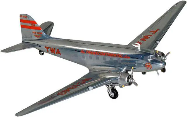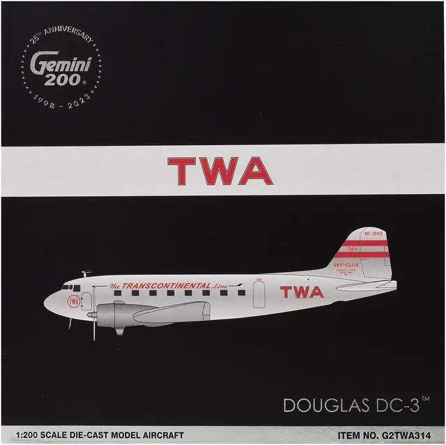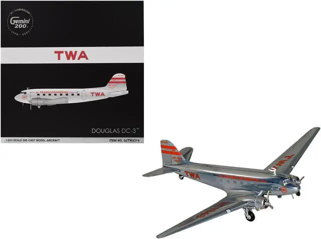 Brand new 1/200 scale diecast airplane model of Douglas DC-3 Commercial Aircraft "TWA (Trans World Airlines) " (NC1943) Polished Metal Finish with Red Tail Stripes "Gemini 200" Series die cast model by GeminiJets.