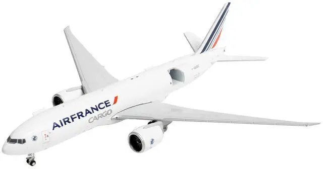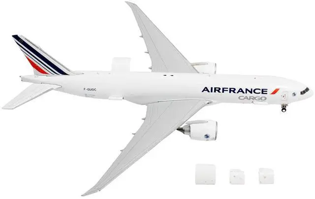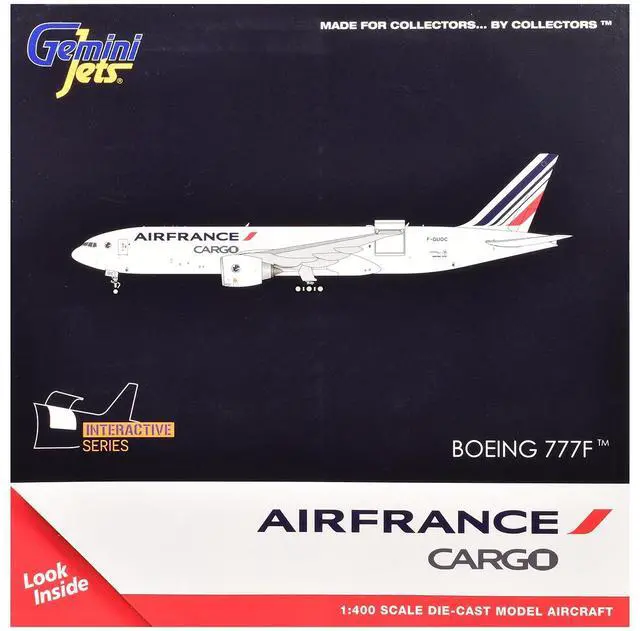 Brand new 1/400 scale diecast airplane model of Boeing 777F Commercial Aircraft "Air France Cargo" (F-GUOC) White with Red and Blue Striped Tail "Interactive Series" die cast model by GeminiJets.