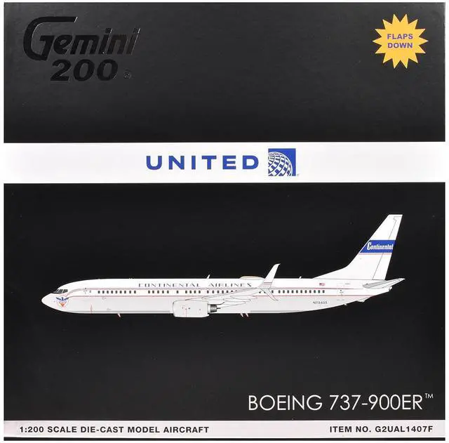 Brand new 1/200 scale diecast airplane model of Boeing 737-900ER Commercial Aircraft with Flaps Down "Continental Airlines - United Airlines" (N75435) White with Red and Blue Stripes "Gemini 200" Series die cast model by GeminiJets.